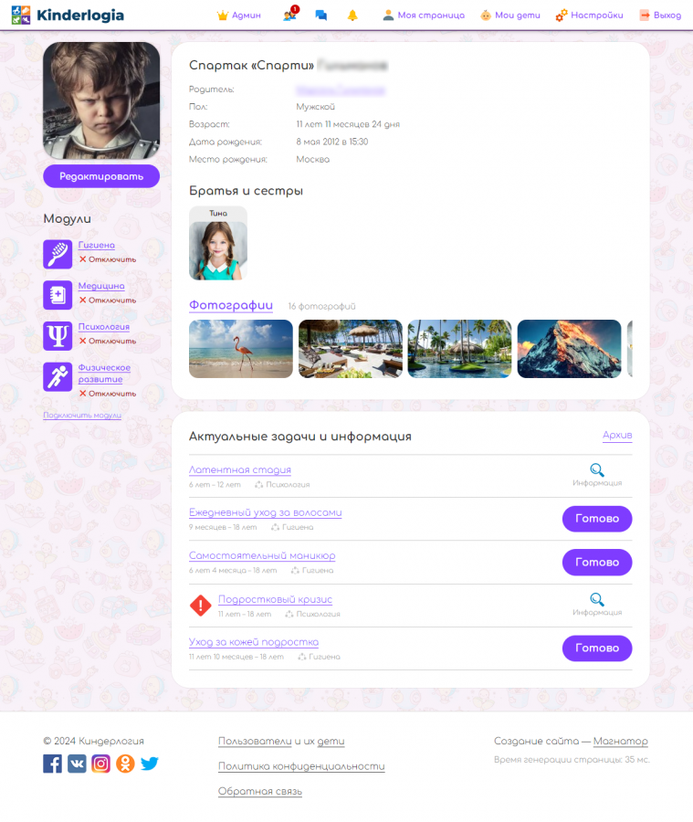 Платформа для родителей с автоматическими рекоммендациями и напоминаниями по актуальному для детей возрасту. Включает социальную сеть для общения с другими родителями и обмена фотографиями. Проектирование и разработка.