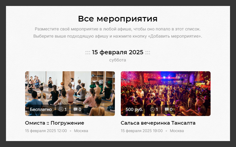 Добавлен тип атома «Афиша», в котором можно публиковать мероприятия. В зависимости от настроек, мероприятия могут добавлять либо руководители хаба, либо все желающие через модерацию или саморегуляцию. Также доступны другие настройки, включая параметры мероприятий, как в справочниках.