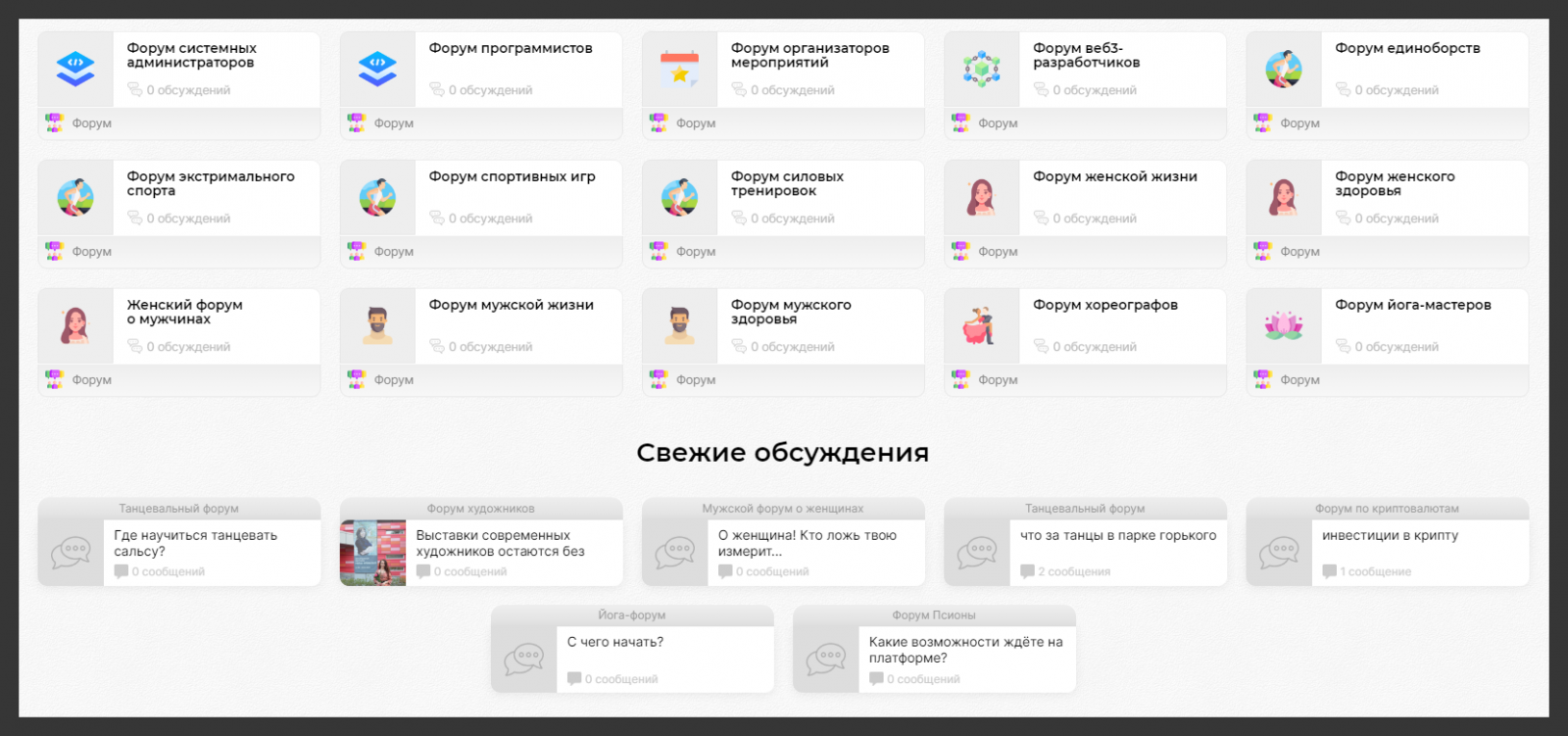 Добавлен тип атома «Форум», в котором можно создавать обсуждения. В зависимости от настроек обсуждения могут создавать либо руководители хаба, либо все желающие через модерацию или саморегуляцию. Также доступны другие настройки, включая параметры обсуждений, как в справочниках.