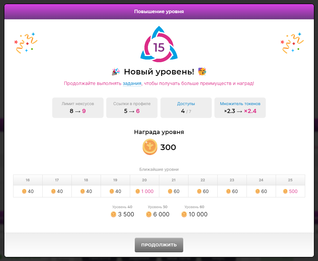 За достижение каждого уровня вы получаете дополнительные награды, а за каждые 10 уровней участников, которых вы пригласили на платформу, вы получаете дополнительные награды от 500 до 10 000 монет.