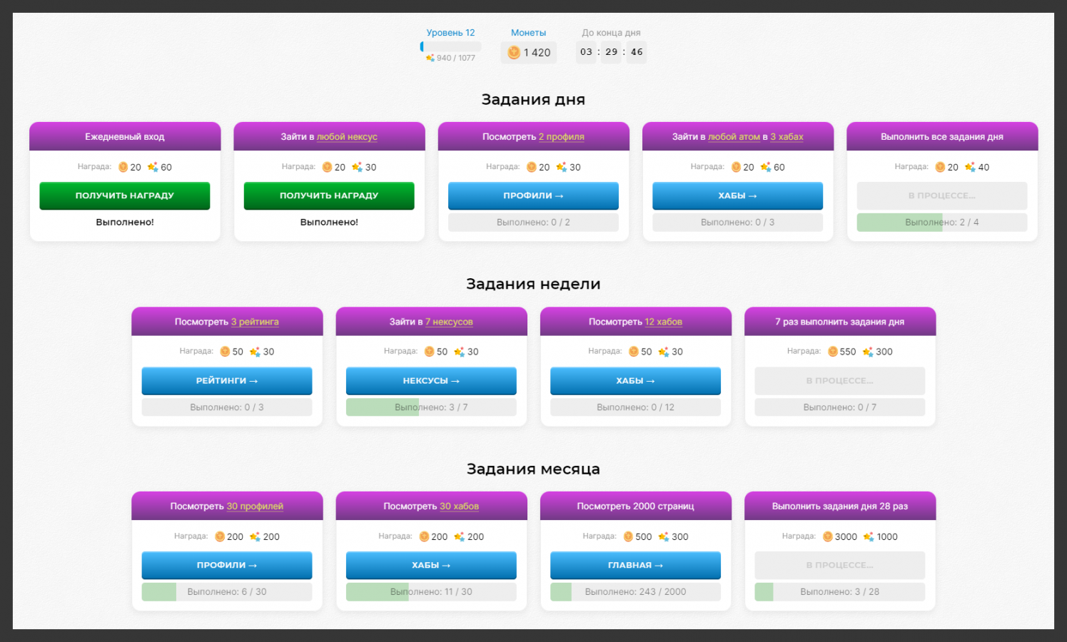 Добавлены пояснения по заданиям, которые быстро и просто знакомят с основными понятиями платформы. Сами задания дня были упрощены. Появились задания недели и месяца, позволяющие получать еще больше монет и опыта. Улучшен общий вид страницы заданий.
