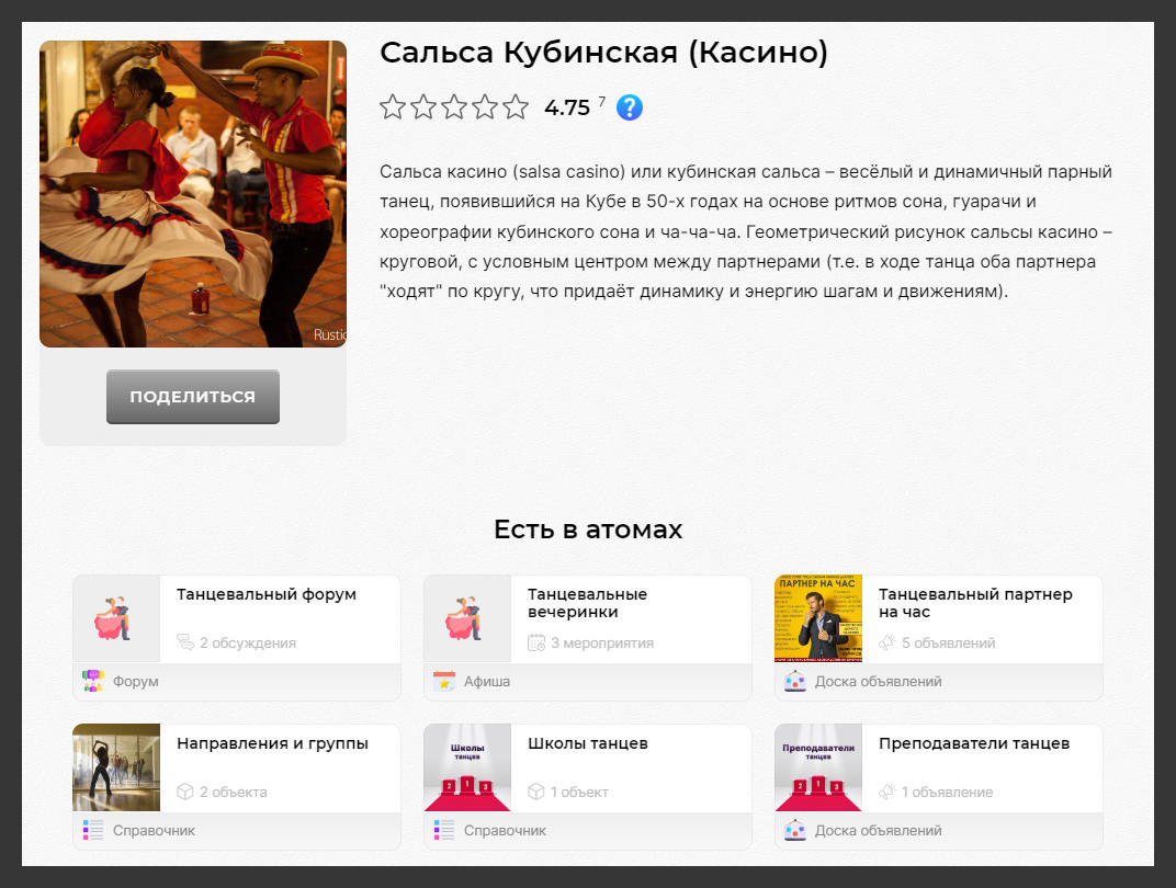 Появилась кросс-навигация между справочниками. Например, если в справочнике танцевальных направлений выбрать сальсу, то можно быстро перейти к списку школ и преподавателей по этому направлению, а также к другим справочникам, афишам, доскам объявлений, витринам и форумам, в которых используется справочник танцевальных направлений и присутствует сальса.